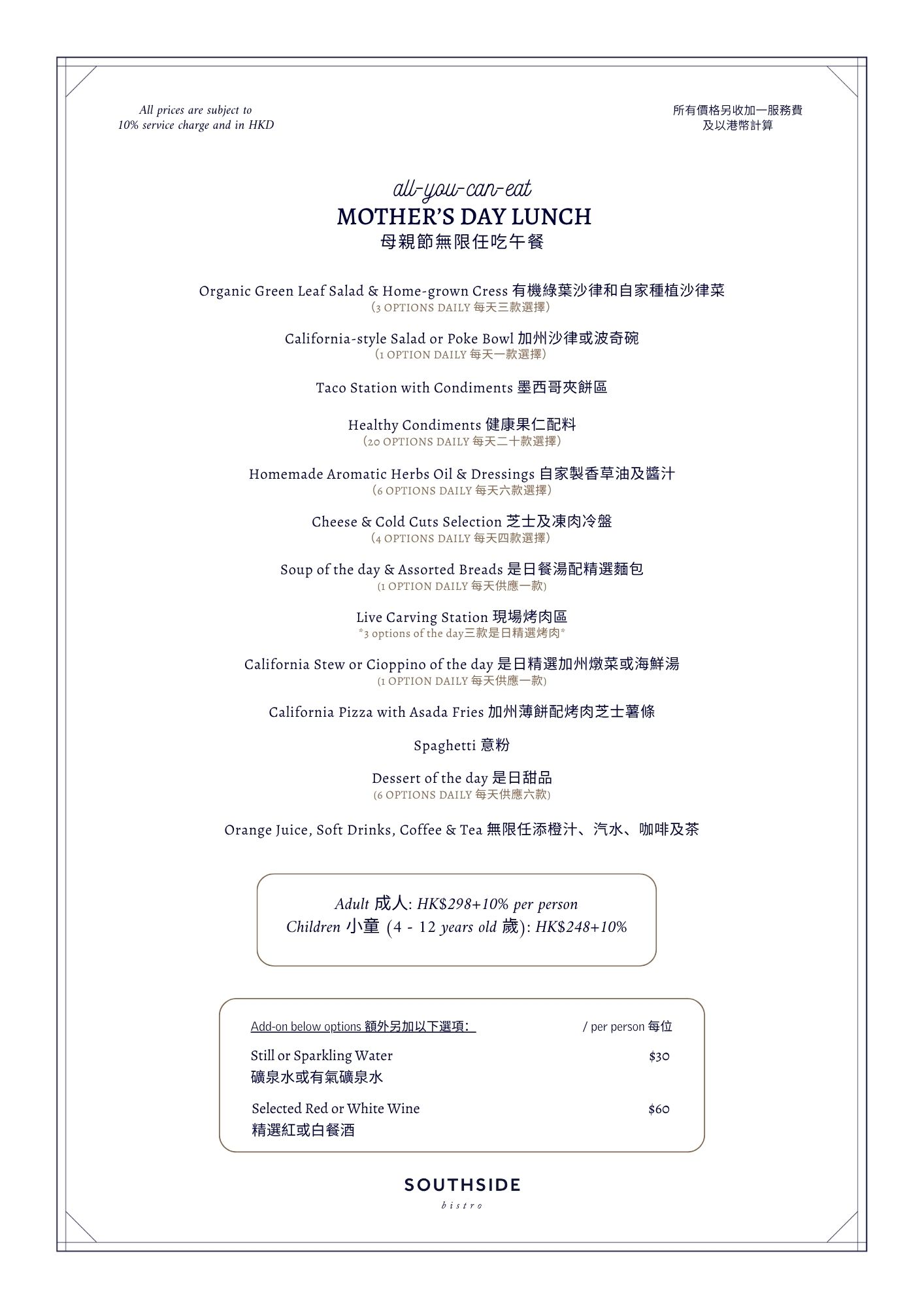 蒞臨 Southside Bistro,與媽媽一同享用豐盛的母親節無限任吃午餐!盡情品嚐滋味健康的沙律吧、墨西哥夾餅及現場烤肉區、是日餐湯及精選意粉,並以精緻甜品作完美句號。餐飲更包括無限任添橙汁、汽水、咖啡或茶。成人原價 HK$298+10%,兒童 (4 – 12歲) HK$248+10%。
