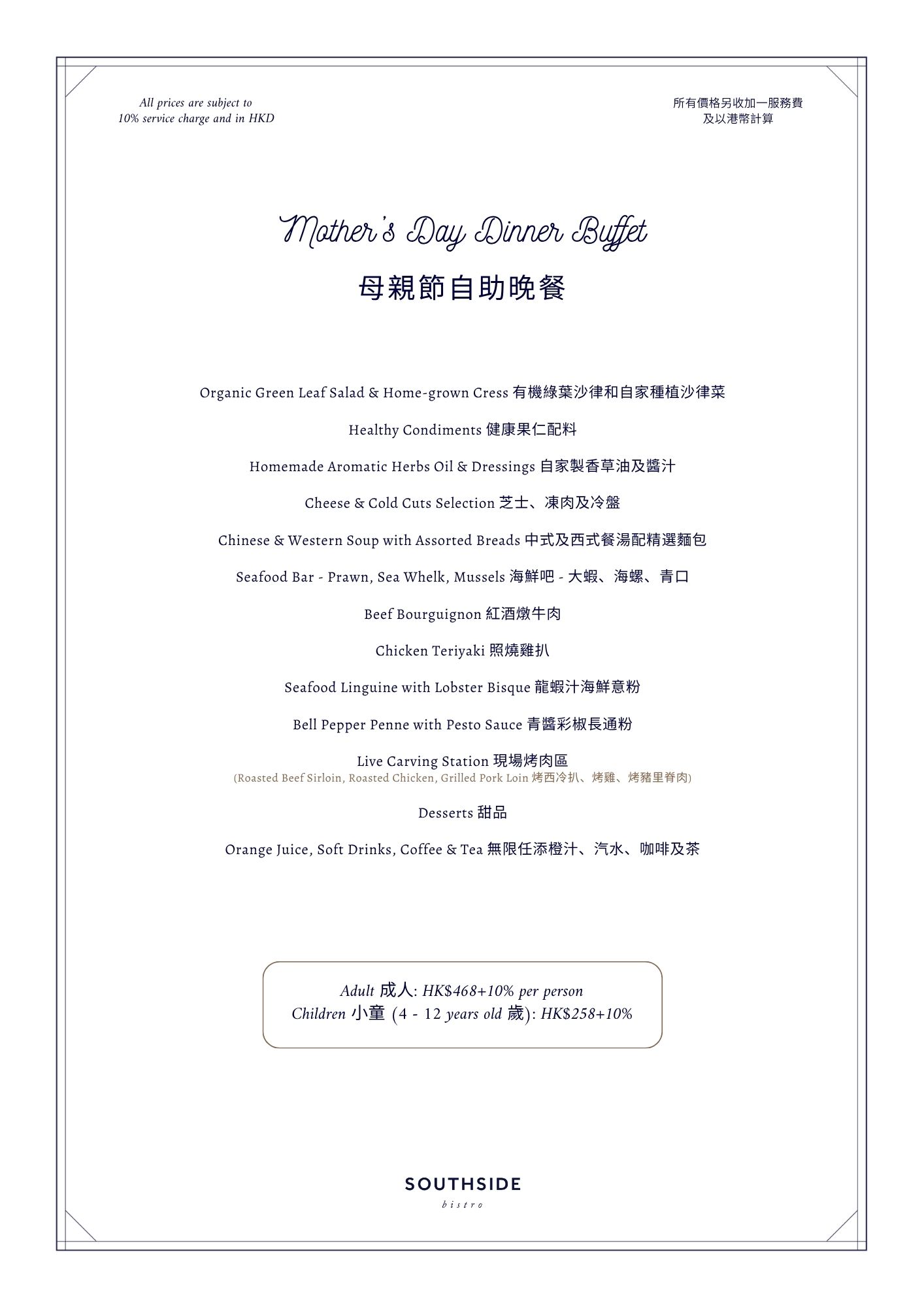 Southside Bistro 於母親節晚上呈獻豐盛自助晚餐,匯聚冰鎮海鮮、精緻熱葷(如紅酒燉牛肉、龍蝦汁海鮮意粉)、多款美味烤肉及一系列賣相精緻的甜品,讓饕客盡情於沉醉美食之中。自助晚餐亦包括無限任飲汽水、橙汁、咖啡及茶。成人原價 HK$468+10%,兒童 (4 – 12歲) HK$258+10%。