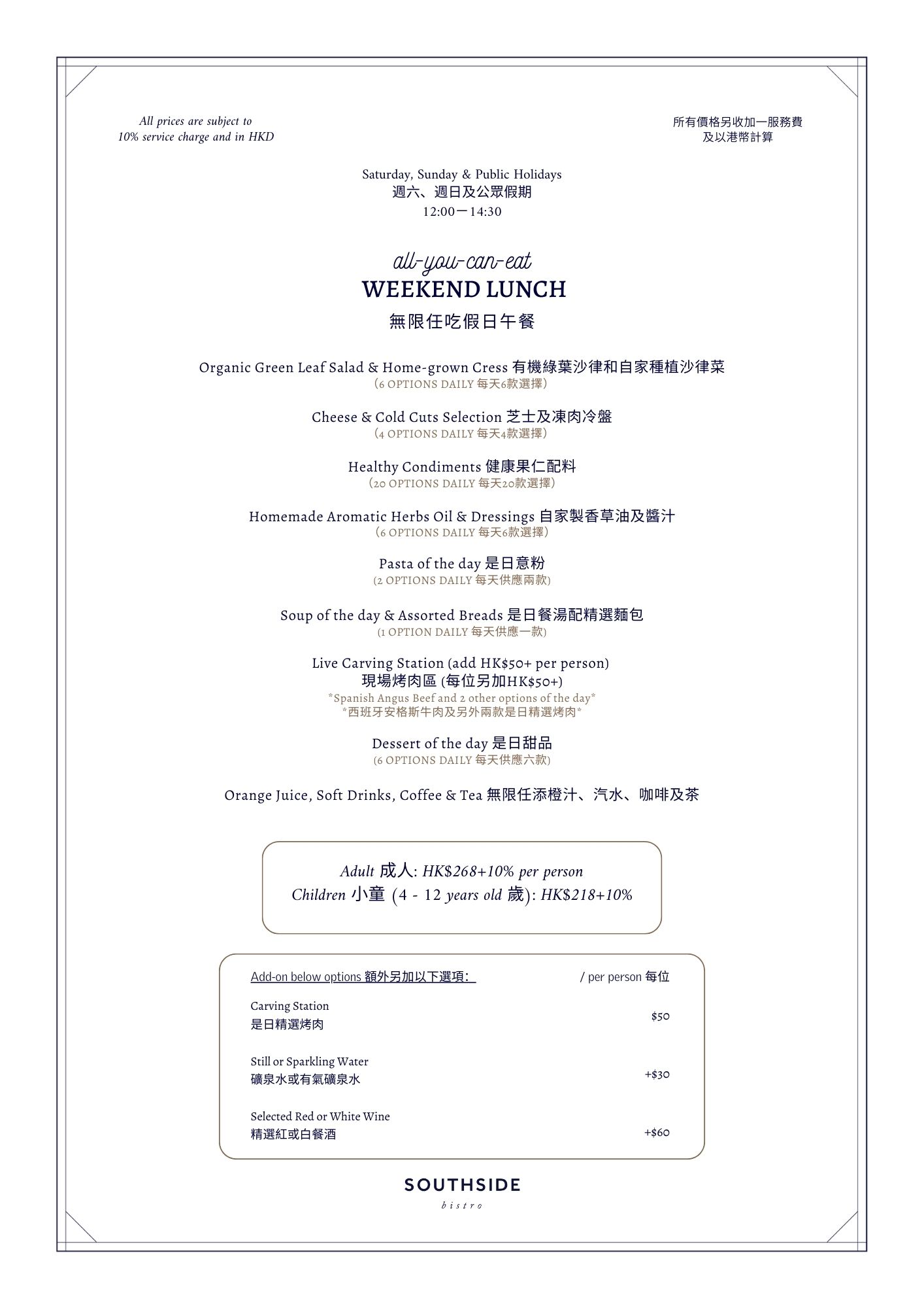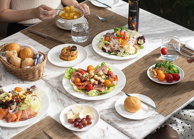 此外,您可盡情細味滋味健康的沙律吧、是日湯品及精選意粉,還有精緻甜品,以及無限添飲橙汁和汽水。賓客還可以額外支付每位 HK$50+10%,享受無限供應的烤肉美食,大快朵頤!