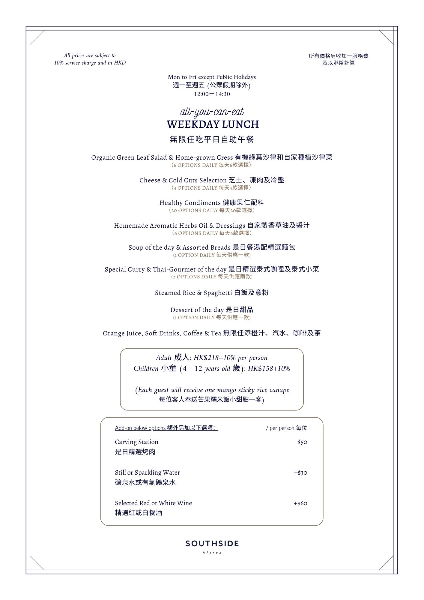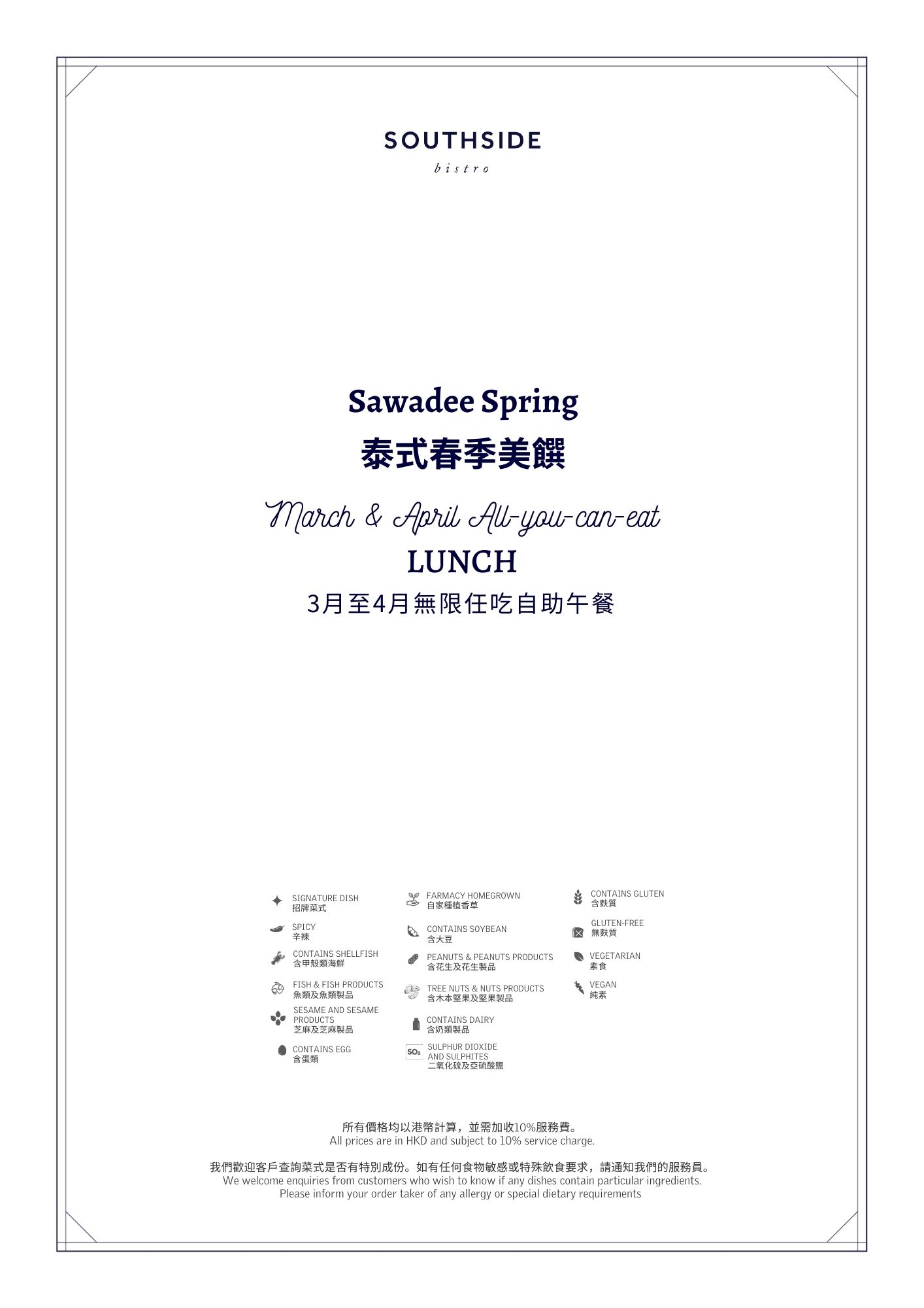 春季啟味,三月至四月期間,Southside Bistro 於平日午市時段推出西式與泰式美食。以微辣滋味美食驅趕春日的濕氣,每天輪流供應多款泰式風味佳餚,如冬蔭功湯、椰子雞湯、咖喱海鮮、泰式碎肉生菜包等!每位賓客更可獲得芒果糯米飯小點心,泰Good!